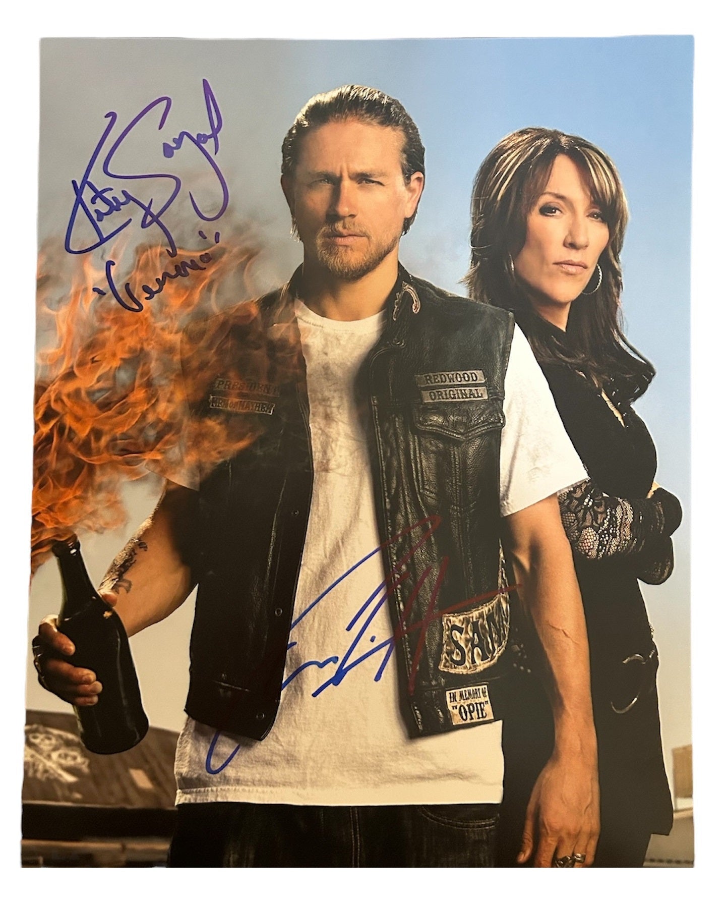 -Signed in person by Charlie Hunnam & Katey Sagal with a blue sharpie so you don't have to worry about the autograph fading.