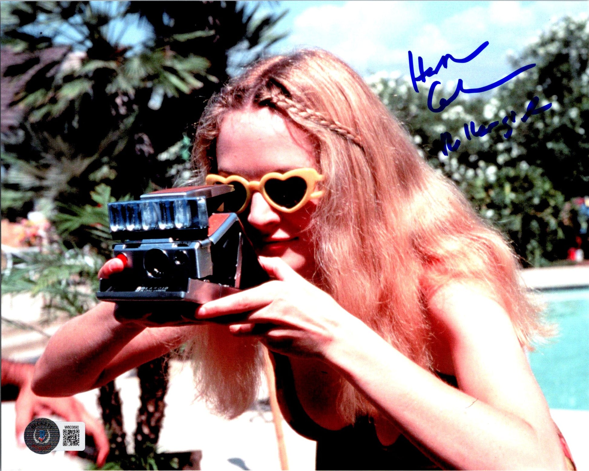 -This signed photo features a new Beckett Witness Hologram QR Code, which means a Beckett Authentication Representative was present when the photo was signed by Heather Graham. The new Beckett Witness Hologram QR code does not come with a matching Beckett Card, instead it is verified by a scannable QR Code that brings up the Beckett COA Authentication site.