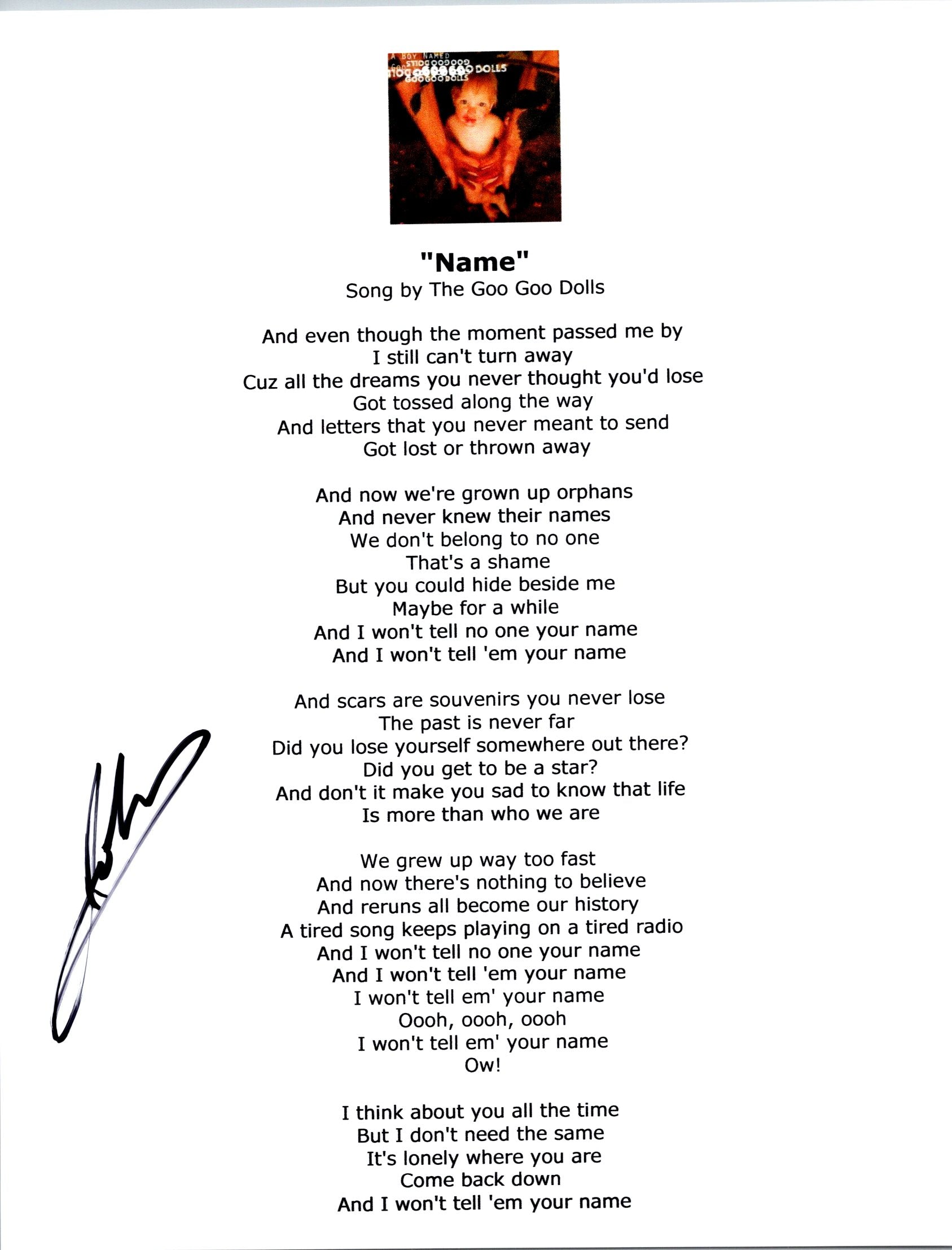 John Rzeznik Signed Autographed 8.5x11 Goo Goo Dolls Name Lyric Sheet with Exact Photo Proof