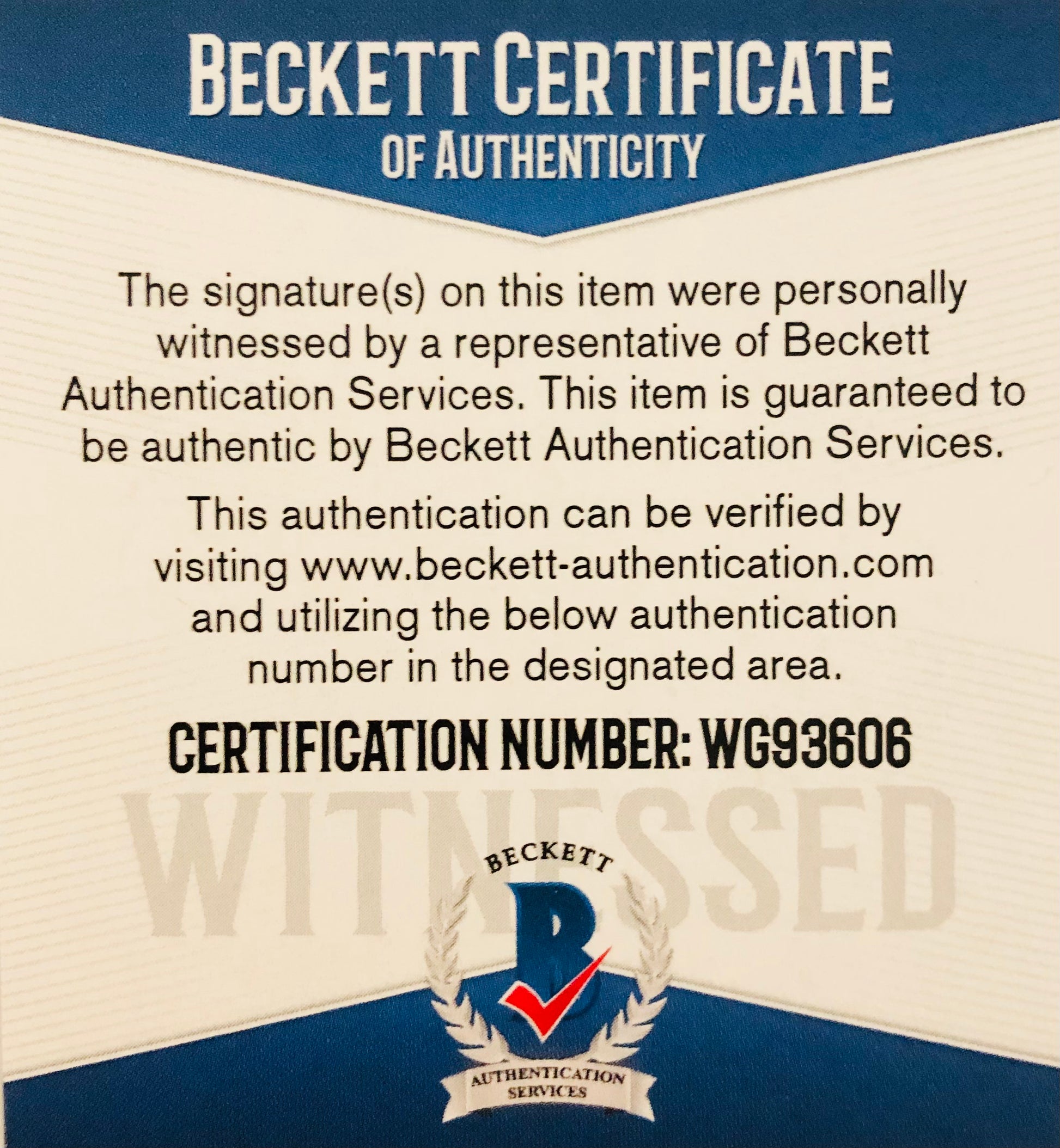 -Comes with a Beckett Certificate of Authenticity. Beckett Cert # WG93606
