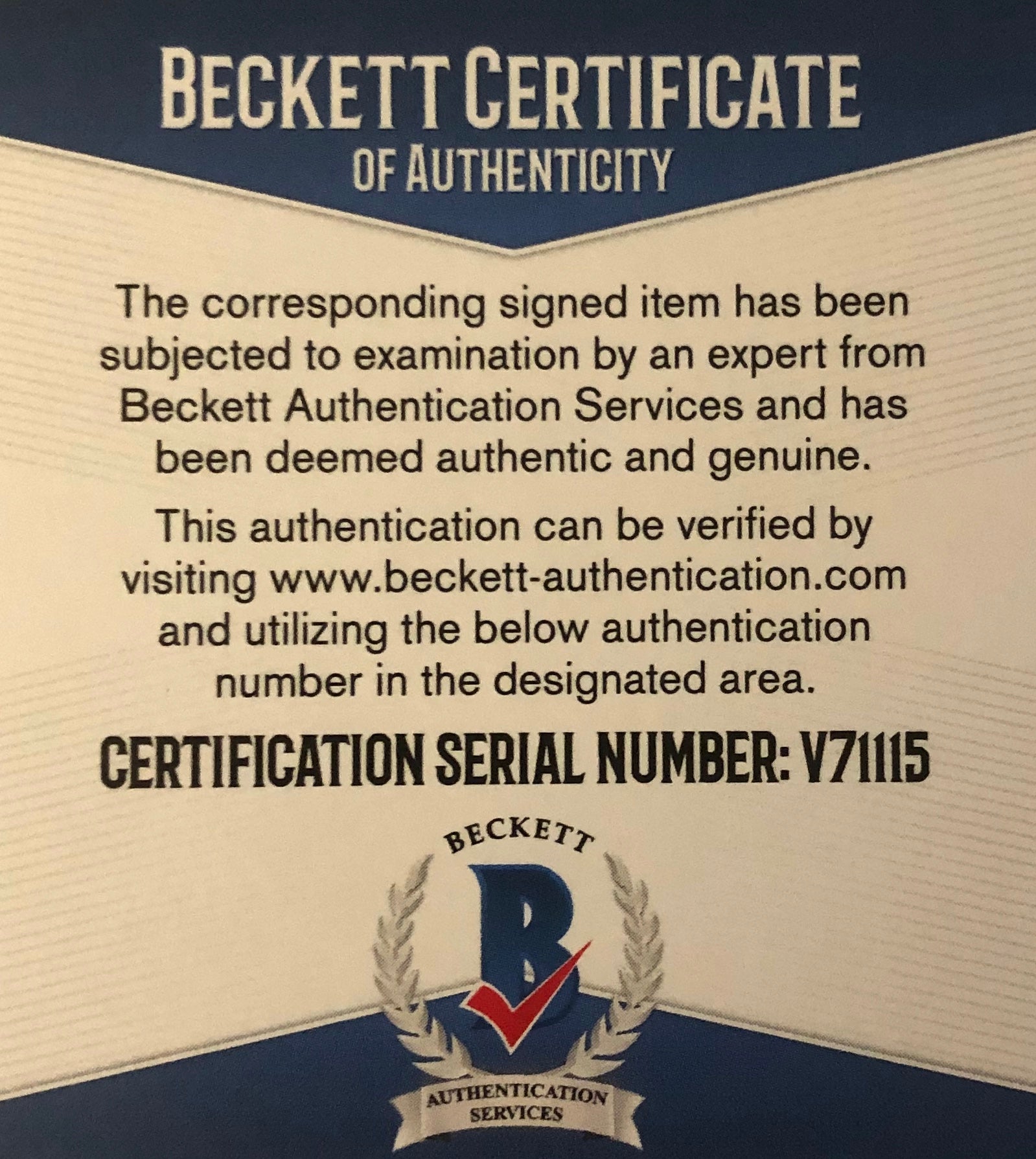 -Comes with a Beckett Certificate of Authenticity. Beckett Cert # V71115