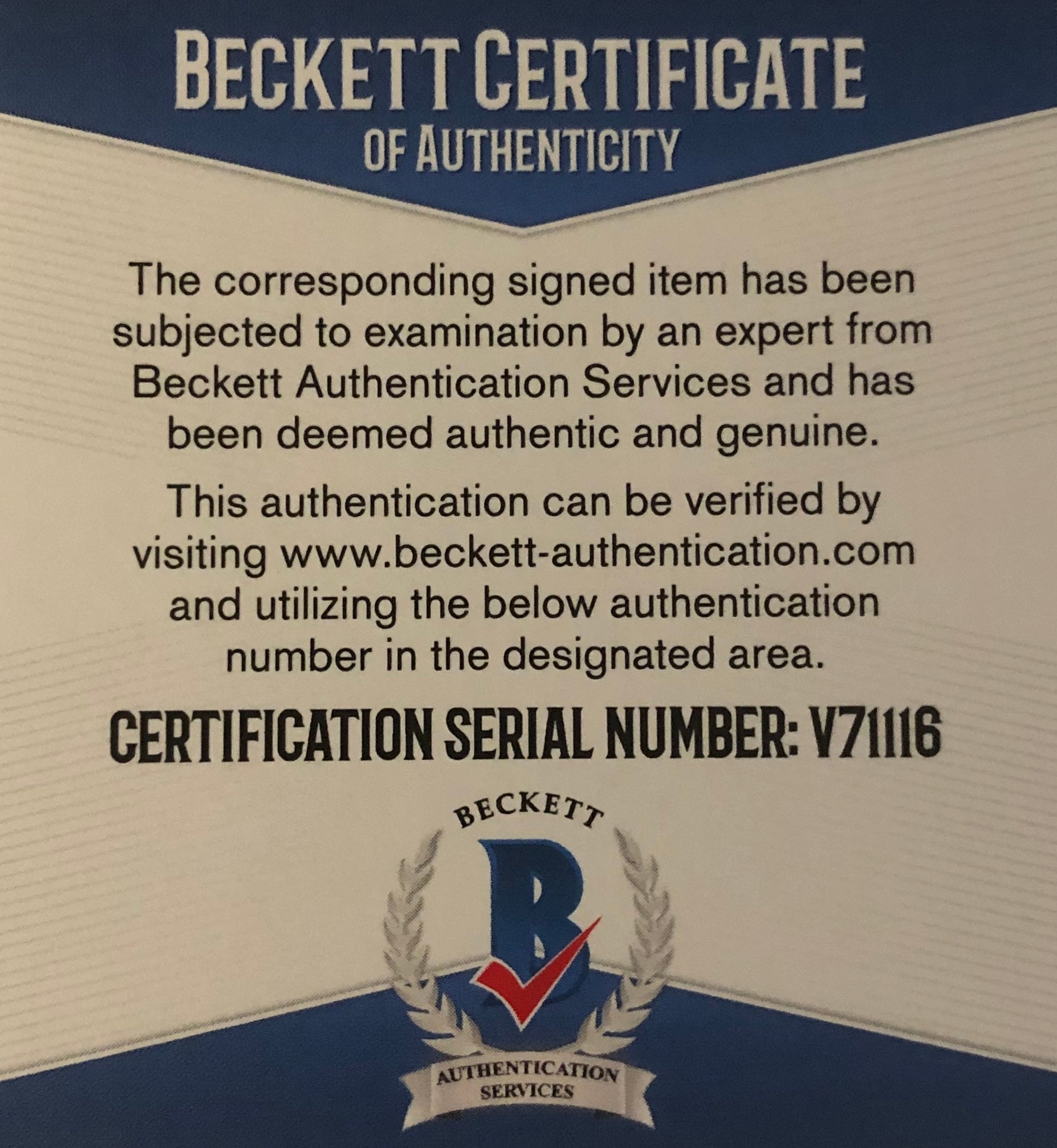 -Comes with a Beckett Certificate of Authenticity. Beckett Cert # V71116