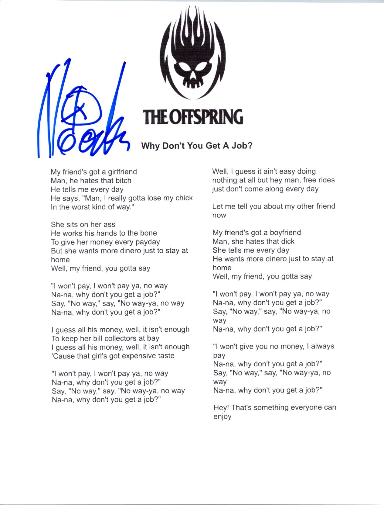-The lyric sheet Noodles signed is "Why Don't You Get A Job" one of the bands most popular songs